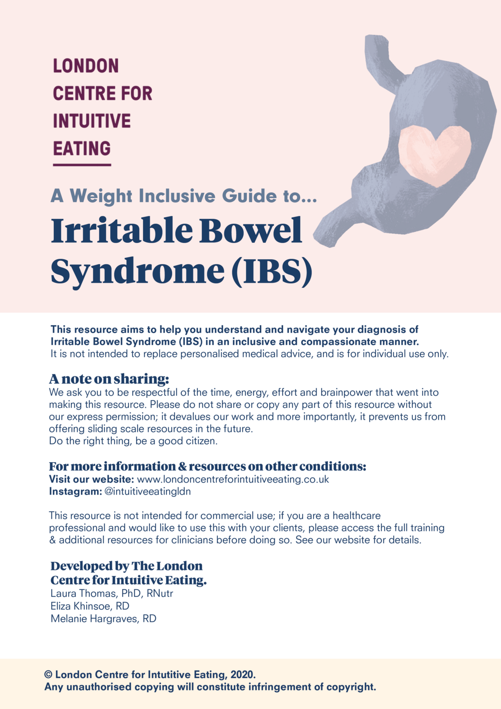 - A comprehensive body-affirming e-book guide to IBS including information about what it is (and isn't), how it's diagnosed, the symptoms and underlying characteristics, the contributing risk factors for the development of IBS, and our guide to managing your condition without turning to punishing diets or punitive exercise.